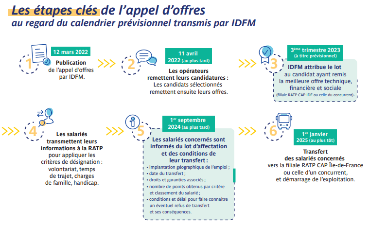 Un appel d’offres est composé de plusieurs étapes dont le calendrier est fixé par IDFM, l’autorité organisatrice, depuis la publication de l’avis de concession jusqu’au transfert du personnel, à compter du 1er janvier 2025.