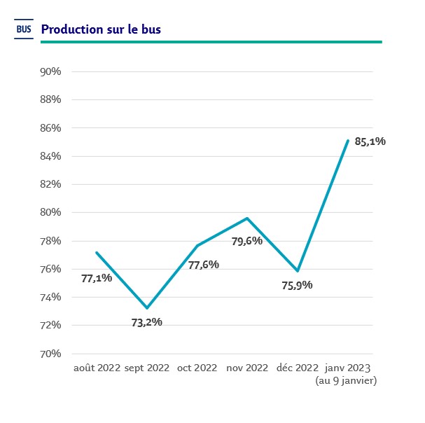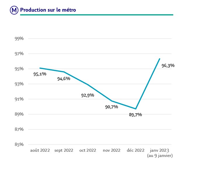 La réalisation de l’offre de service de la RATP a connu une dégradation importante au second semestre 2022. Cependant, le mois de janvier montre une dynamique d’amélioration importante même si le service reste perturbé sur certaines lignes du réseau.