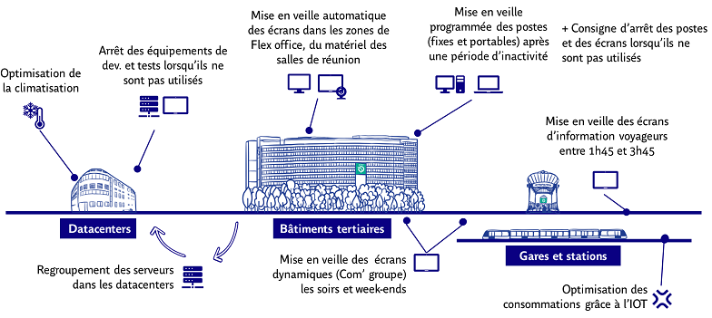 - Mise à l’arrêt des équipements de développement et de test pour les services télécoms et industriels (écrans d’information voyageurs, équipements vidéo, unités centrales, baies industrielles, stations de base Tetra…) lorsqu’ils ne sont pas utilisés.